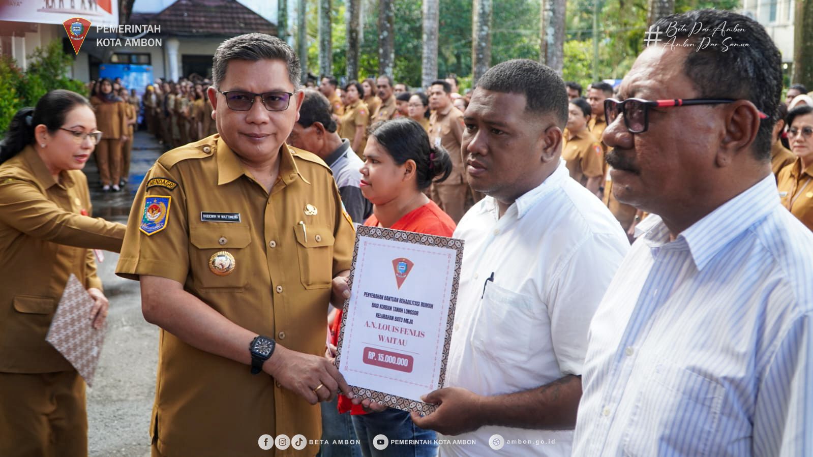 Untuk diketahui penerima bantuan Stimulan yakni 8 (delapan) rumah di Gang Banjo, Batumerah dan 5 (lima) Rumah korban bencana Tanah Longsor, yang mendapatkan masing – masing uang tunai sebesar Rp. 15 Juta rupiah