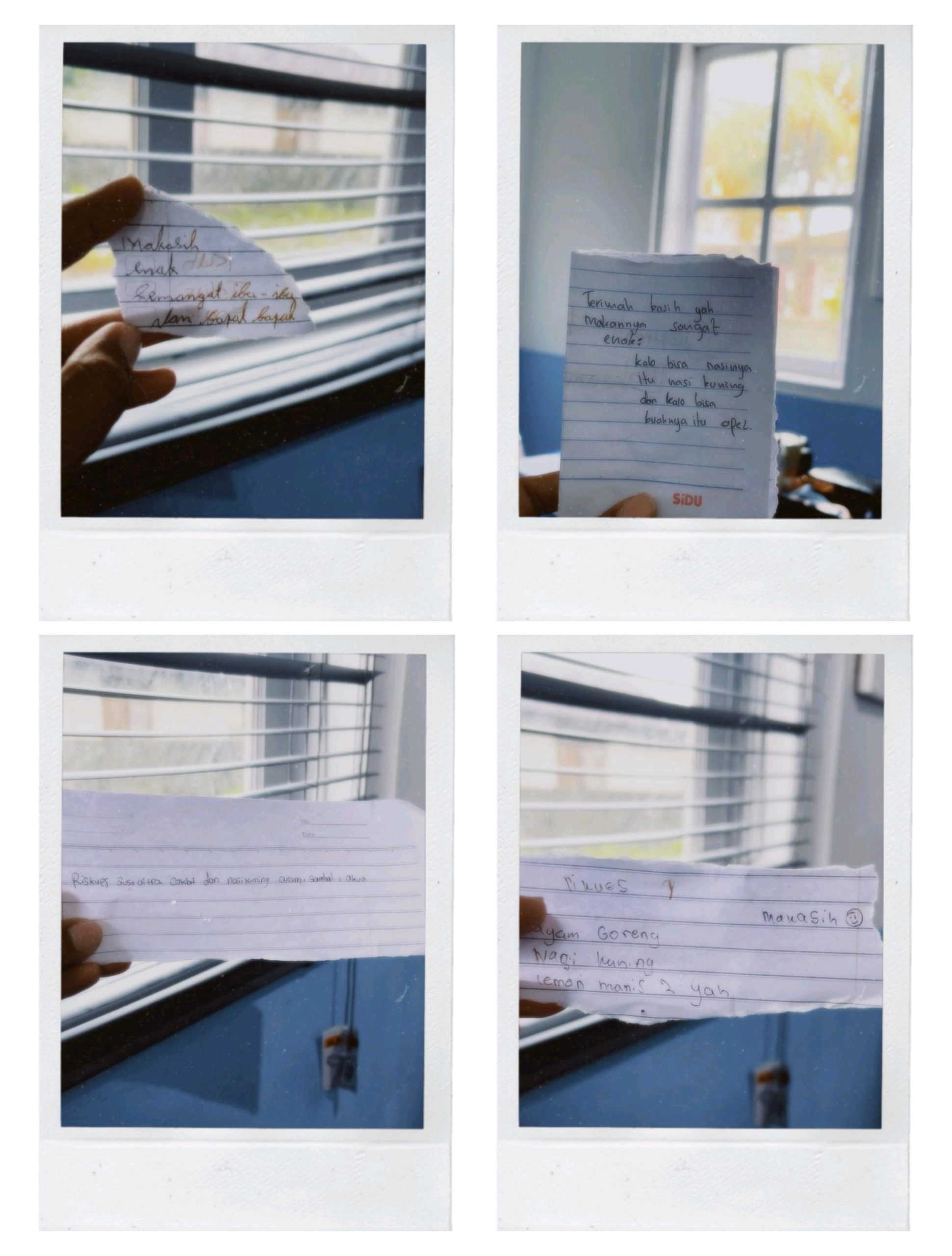Pantauan suaranusaina.id, Rabu (28/1/2026), surat-surat kecil itu ditulis di kertas robekan buku, bahkan ada yang disertai uang sebesar Rp2.000 sebagai bentuk apresiasi. Isi pesannya beragam, mulai dari ucapan terima kasih hingga permintaan menu makanan favorit.