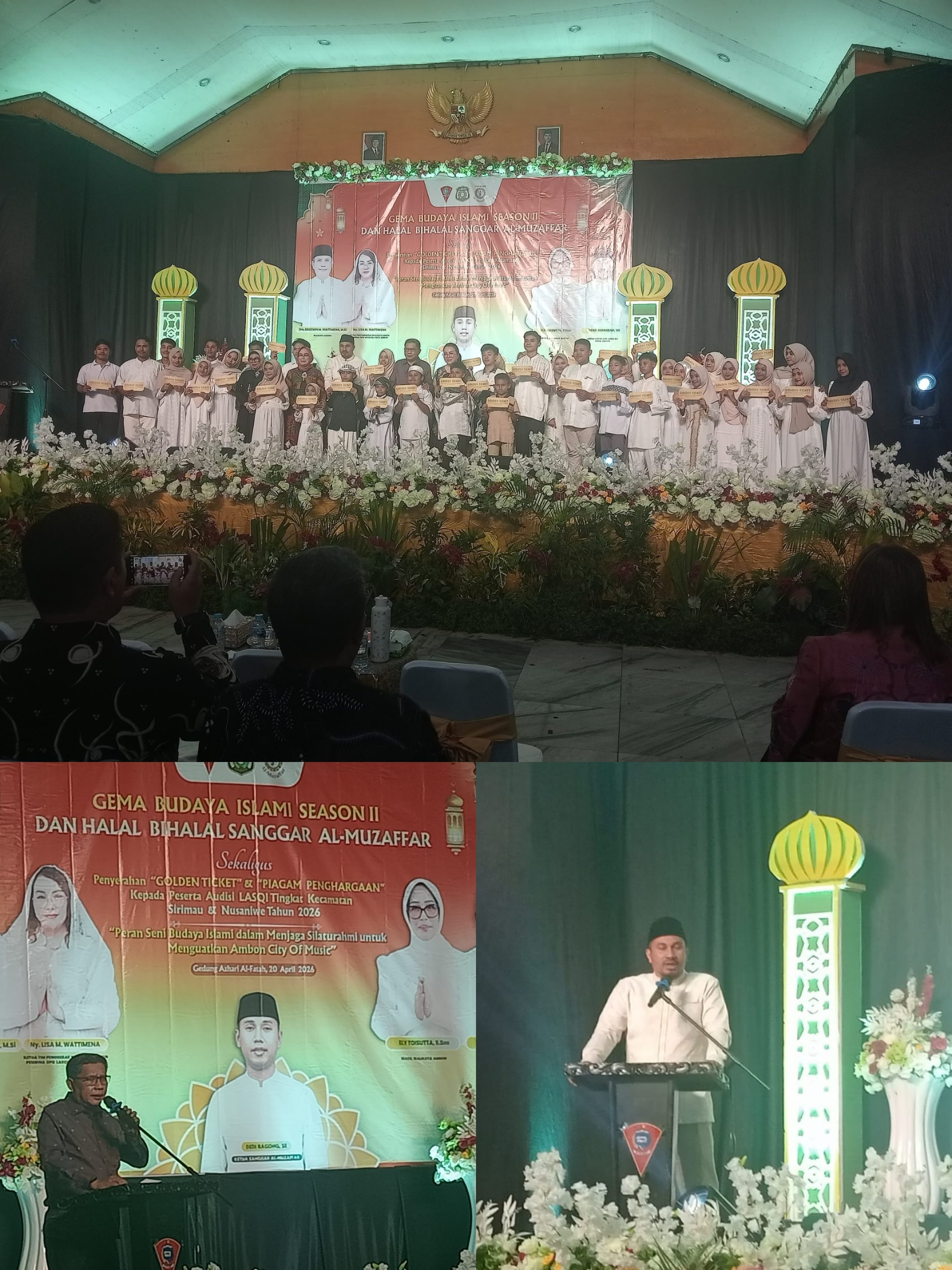 SNI.ID, AMBON : Wali Kota Ambon Bodewin M. Wattimena menghadiri kegiatan Gema Budaya Islami Season II dan Halal Bihalal Sanggar Al-Muzaffar yang digelar di Gedung Azhari Al-Fatah Ambon, Senin (20/4/2026). Kegiatan tersebut juga dirangkaikan dengan penyerahan golden ticket serta piagam penghargaan kepada peserta audisi LASQI tingkat Kecamatan Sirimau dan Nusaniwe tahun 2026.