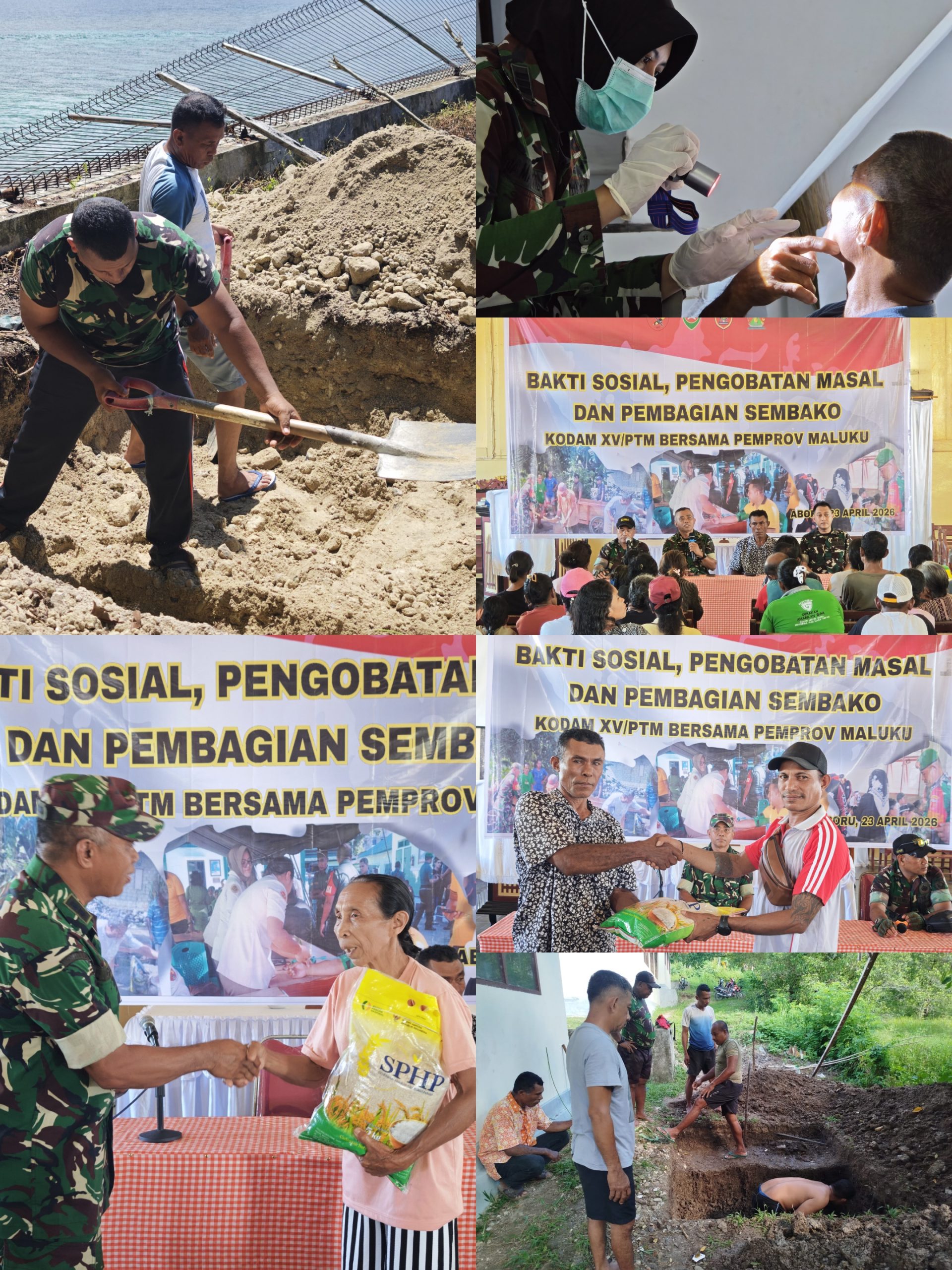 SNI.ID, MALTENG : Kodam XV/Pattimura bersama Pemerintah Provinsi Maluku yang didukung Pemerintah Negeri Aboru menggelar kegiatan bakti sosial berupa pengobatan massal, pembagian sembako, serta pembangunan fasilitas MCK di Negeri Aboru, Kecamatan Haruku, Kabupaten Maluku Tengah, Kamis (23/4/2026).