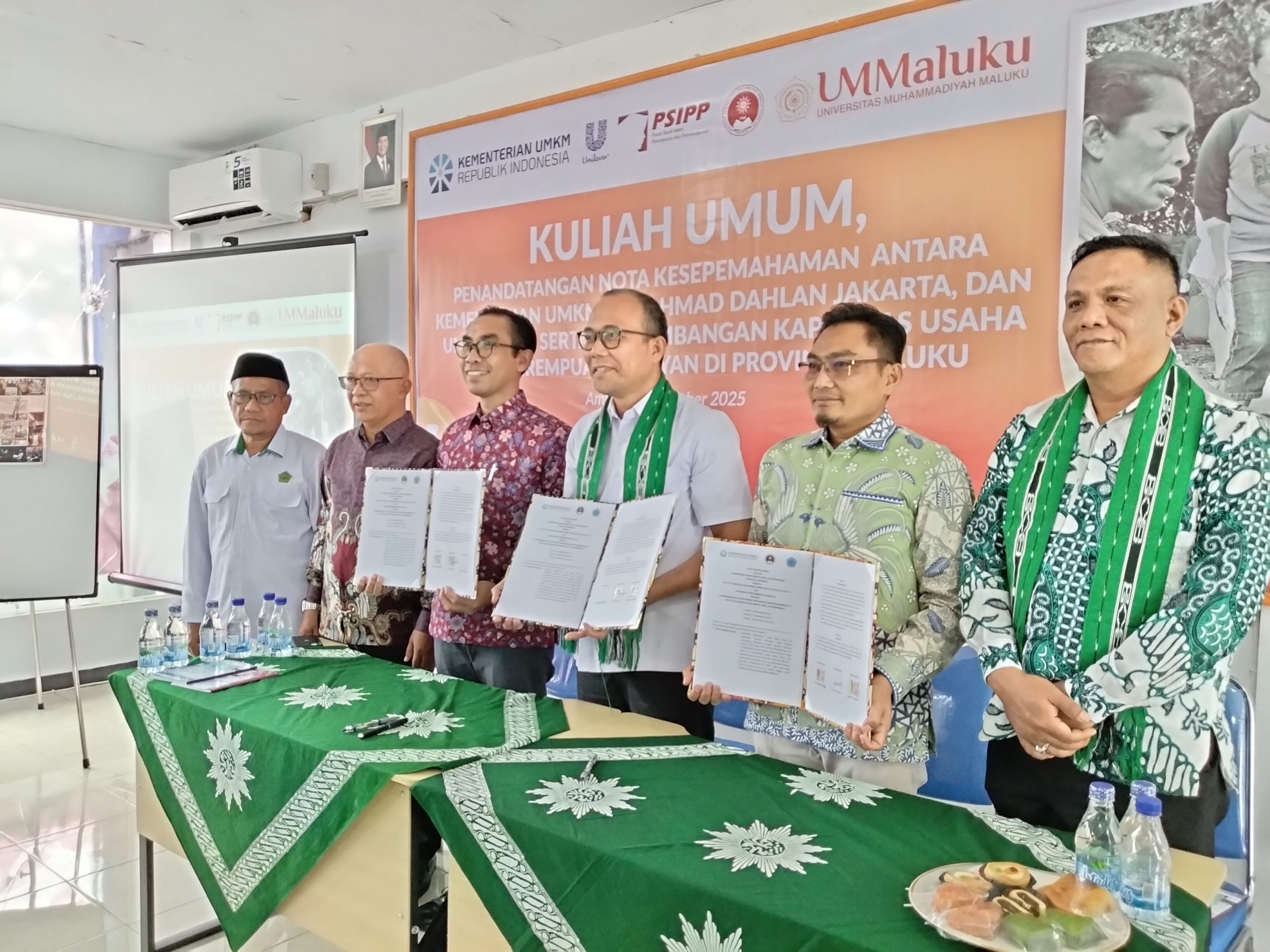 SNI.ID, AMBON : Universitas Muhammadiyah Maluku (UM Maluku) bersama Kementerian UMKM RI dan Institut Teknologi dan Bisnis Ahmad Dahlan (ITB-AD) Jakarta menjalin kerja sama strategis untuk meningkatkan kapasitas ekonomi perempuan nelayan rentan di Provinsi Maluku. Kolaborasi ini dikukuhkan melalui Kuliah Umum, penandatanganan Nota Kesepahaman (MoU), serta Focus Group Discussion (FGD) yang berlangsung di Kampus UM Maluku, Senin (1/12/2025).